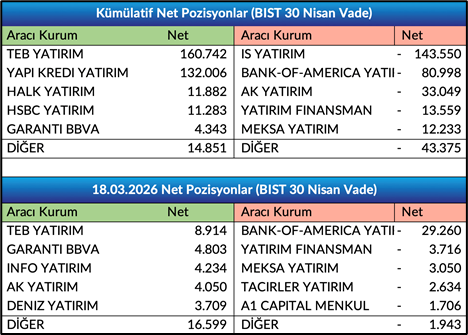 - Nisan Vade Endeks Sözleşmesinde açık pozisyon sayısı 8.404 artışla 474.858 adete yükseldi. Nisan Vade Endeks Sözleşmesinde önceki işlem gününde gerçekleşen işlemlerde ilk 5 kurum bazında nette 14.656 adet satış gerçekleşirken, kümülatif net pozisyonlar tarafında ilk 5 kurum bazında 28.524 adet fark ile alışların baskın olduğunu, önceki güne göre ilk 5 kurum bazında farkın alıcılar lehine azaldığını gözlemliyoruz. Bir önceki gün ilk 5 kurum bazında fark 42.779 adet alıcılar lehineydi.