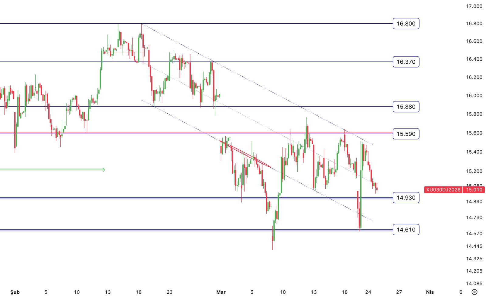 - Nisan Vade Endeks Sözleşmesi 14.971,00 – 15.409,00 aralığında hareket ettiği günü %2,37 değer kaybıyla 15.087,00 puan seviyesinden tamamladı.Teknik olarak değerlendirecek olursak; Nisan Vade Endeks Sözleşmesinin 5 ve 22 günlük üssel hareketli ortalamanın altında kapanış gerçekleştirdiğini izliyoruz. Sözleşmede kısa vadeli teknik göstergelerin satış yönünde sinyaller verdiğini görüyoruz. Satıcılı seyrin devam etmesi halinde sırasıyla 14.930 ve 14.610 destek olarak takip edilebilir. Gün içi olası yükselişlerde 15.225 ve 15.590 direnç olarak takip edilebilir.