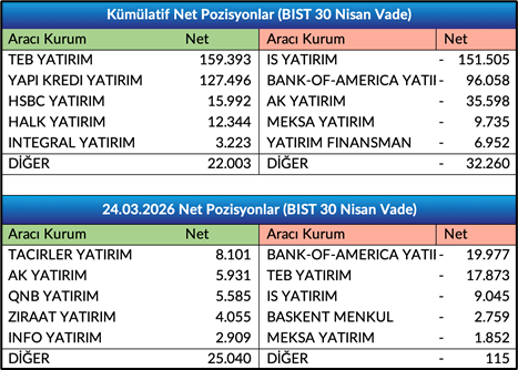 - Nisan Vade Endeks Sözleşmesinde açık pozisyon sayısı 8.443 artışla 511.507 adete yükseldi.Nisan Vade Endeks Sözleşmesinde önceki işlem gününde gerçekleşen işlemlerde ilk 5 kurum bazında nette 24.925 adet satış gerçekleşirken, kümülatif net pozisyonlar tarafında ilk 5 kurum bazında 10.257 adet fark ile alışların baskın olduğunu, önceki güne göre ilk 5 kurum bazında farkın alıcılar lehine azaldığını gözlemliyoruz. Bir önceki gün ilk 5 kurum bazında fark 48.451 adet alıcılar lehineydi.