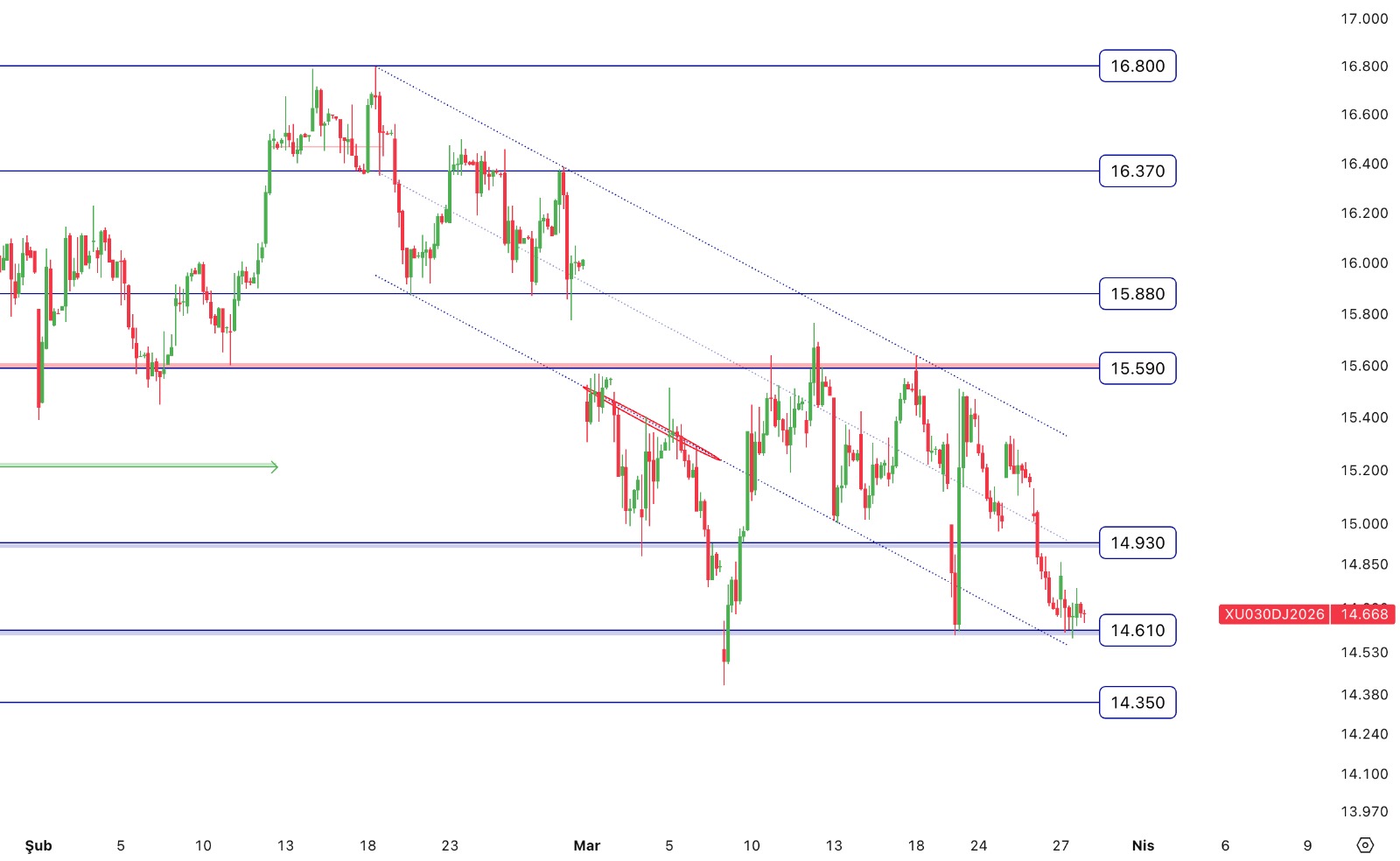- Nisan Vade Endeks Sözleşmesi 14.580,00 – 14.859,00 aralığında hareket ettiği günü %0,32 değer kaybıyla 14.719,00 puan seviyesinden tamamladı.Teknik olarak değerlendirecek olursak; Nisan Vade Endeks Sözleşmesinin 5 ve 22 günlük üssel hareketli ortalamanın altında kapanış gerçekleştirdiğini izliyoruz. Sözleşmede kısa vadeli teknik göstergelerin satış yönünde sinyaller verdiğini görüyoruz. Satıcılı seyrin devam etmesi halinde sırasıyla 14.610 ve 14.350 destek olarak takip edilebilir. Gün içi olası yükselişlerde 14.930 ve 15.225 direnç olarak takip edilebilir.