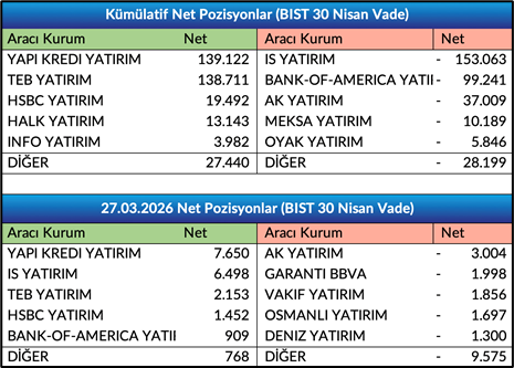 - Nisan Vade Endeks Sözleşmesinde açık pozisyon sayısı 5.579 artışla 531.296 adete yükseldi.Nisan Vade Endeks Sözleşmesinde önceki işlem gününde gerçekleşen işlemlerde ilk 5 kurum bazında nette 8.807 adet alış gerçekleşirken, kümülatif net pozisyonlar tarafında ilk 5 kurum bazında 759 adet fark ile alışların baskın olduğunu, önceki güne göre ilk 5 kurum bazında farkın alıcılar lehine arttığını gözlemliyoruz. Bir önceki gün ilk 5 kurum bazında fark 13.027 adet satıcılar lehineydi.