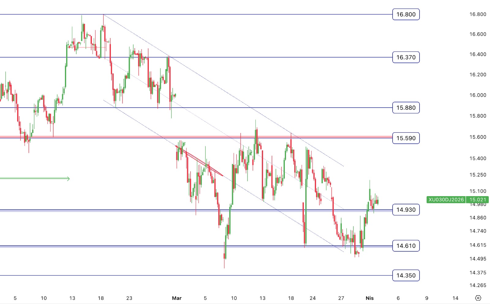 - Nisan Vade Endeks Sözleşmesi 14.898,00 – 15.200,00 aralığında hareket ettiği günü %1,59 değer kazancıyla 15.033,00 puan seviyesinden tamamladı.Teknik olarak değerlendirecek olursak; Nisan Vade Endeks Sözleşmesinin 5 günlük üssel hareketli ortalamanın üstünde kapanış gerçekleştirdiğini izliyoruz. Sözleşmede kısa vadeli teknik göstergelerin alış yönünde sinyaller verdiğini görüyoruz. Alıcılı seyrin devam etmesi halinde sırasıyla 15.225 ve 15.400 direnç olarak takip edilebilir. Gün içi olası geri çekilmelerde 14.930 ve 14.800 destek olarak takip edilebilir.