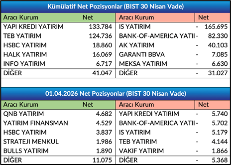 - Nisan Vade Endeks Sözleşmesinde açık pozisyon sayısı 5.165 azalışla 515.040 adete geriledi.Nisan Vade Endeks Sözleşmesinde önceki işlem gününde gerçekleşen işlemlerde ilk 5 kurum bazında nette 5.707 adet satış gerçekleşirken, kümülatif net pozisyonlar tarafında ilk 5 kurum bazında 10.020 adet fark ile satışların baskın olduğunu, önceki güne göre ilk 5 kurum bazında farkın satıcılar lehine arttığını gözlemliyoruz. Bir önceki gün ilk 5 kurum bazında fark 3.921 adet alıcılar lehineydi.