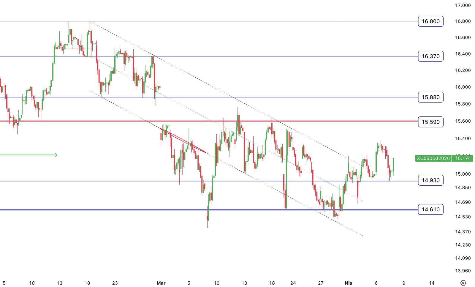 - Nisan Vade Endeks Sözleşmesi 14.921,00 – 15.314,00 aralığında hareket ettiği günü %2,00 değer kaybıyla 14.976,00 puan seviyesinden tamamladı.Teknik olarak değerlendirecek olursak; Nisan Vade Endeks Sözleşmesinin 5 ve 22 günlük üssel hareketli ortalamanın altında kapanış gerçekleştirdiğini izliyoruz. Sözleşmede kısa vadeli teknik göstergelerin satış yönünde sinyaller verdiğini görüyoruz. Satıcılı seyrin devam etmesi halinde sırasıyla 14.930 ve 14.610 destek olarak takip edilebilir. Gün içi olası yükselişlerde 15.225 ve 15.400 direnç olarak takip edilebilir.