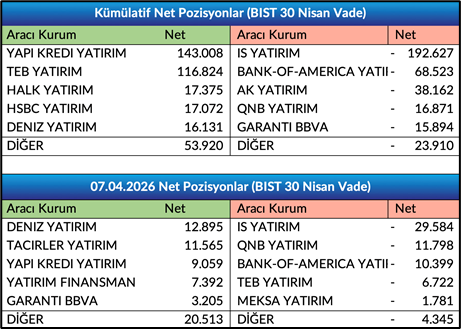 - Nisan Vade Endeks Sözleşmesinde açık pozisyon sayısı 17.663 artışla 509.521 adete yükseldi.Nisan Vade Endeks Sözleşmesinde önceki işlem gününde gerçekleşen işlemlerde ilk 5 kurum bazında nette 16.168 adet satış gerçekleşirken, kümülatif net pozisyonlar tarafında ilk 5 kurum bazında 30.010 adet fark ile satışların baskın olduğunu, önceki güne göre ilk 5 kurum bazında farkın satıcılar lehine arttığını gözlemliyoruz. Bir önceki gün ilk 5 kurum bazında fark 1.788 adet alıcılar lehineydi.