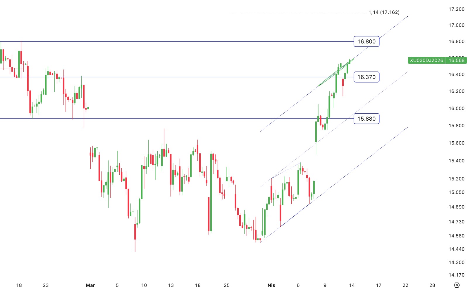 - Nisan Vade Endeks Sözleşmesi 16.140,00 – 16.587,00 aralığında hareket ettiği günü %0,24 değer kazancıyla 16.463,00 puan seviyesinden tamamladı.Teknik olarak değerlendirecek olursak; Nisan Vade Endeks Sözleşmesinin 5 ve 22 günlük üssel hareketli ortalamanın üstünde kapanış gerçekleştirdiğini izliyoruz. Sözleşmede kısa vadeli teknik göstergelerin alış yönünde sinyaller verdiğini görüyoruz. Alıcılı seyrin devam etmesi halinde sırasıyla 16.800 ve 17.000 direnç olarak takip edilebilir. Gün içi olası geri çekilmelerde 16.370 ve 16.100 destek olarak takip edilebilir.