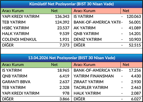 - Nisan Vade Endeks Sözleşmesinde açık pozisyon sayısı 2.211 azalışla 449.979 adete geriledi.Nisan Vade Endeks Sözleşmesinde önceki işlem gününde gerçekleşen işlemlerde ilk 5 kurum bazında nette 2.161 adet alış gerçekleşirken, kümülatif net pozisyonlar tarafında ilk 5 kurum bazında 45.142 adet fark ile alışların baskın olduğunu, önceki güne göre ilk 5 kurum bazında farkın alıcılar lehine arttığını gözlemliyoruz. Bir önceki gün ilk 5 kurum bazında fark 39.771 adet alıcılar lehineydi.