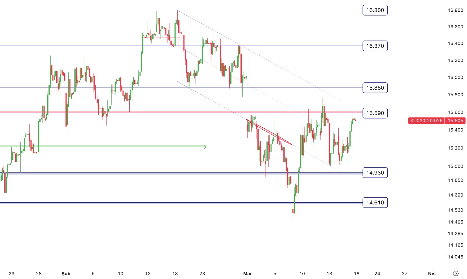 - Teknik olarak değerlendirecek olursak; Nisan Vade Endeks Sözleşmesinin 5 günlük hareketli ortalamanın üstünde kapanış gerçekleştirdiğini izliyoruz. Sözleşmede kısa vadeli teknik göstergelerin alış yönünde sinyaller verdiğini görüyoruz. Alıcılı seyrin devam etmesi halinde sırasıyla 15.590 ve 15.880 direnç olarak takip edilebilir. Gün içi olası geri çekilmelerde 15.225 ve 14.930 destek olarak takip edilebilir.
