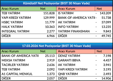 - Nisan Vade Endeks Sözleşmesinde açık pozisyon sayısı 6.056 azalışla 466.454 adete geriledi. Nisan Vade Endeks Sözleşmesinde önceki işlem gününde gerçekleşen işlemlerde ilk 5 kurum bazında nette 12.849 adet alış gerçekleşirken, kümülatif net pozisyonlar tarafında ilk 5 kurum bazında 42.779 adet fark ile alışların baskın olduğunu, önceki güne göre ilk 5 kurum bazında farkın alıcılar lehine arttığını gözlemliyoruz. Bir önceki gün ilk 5 kurum bazında fark 23.704 adet alıcılar lehineydi.