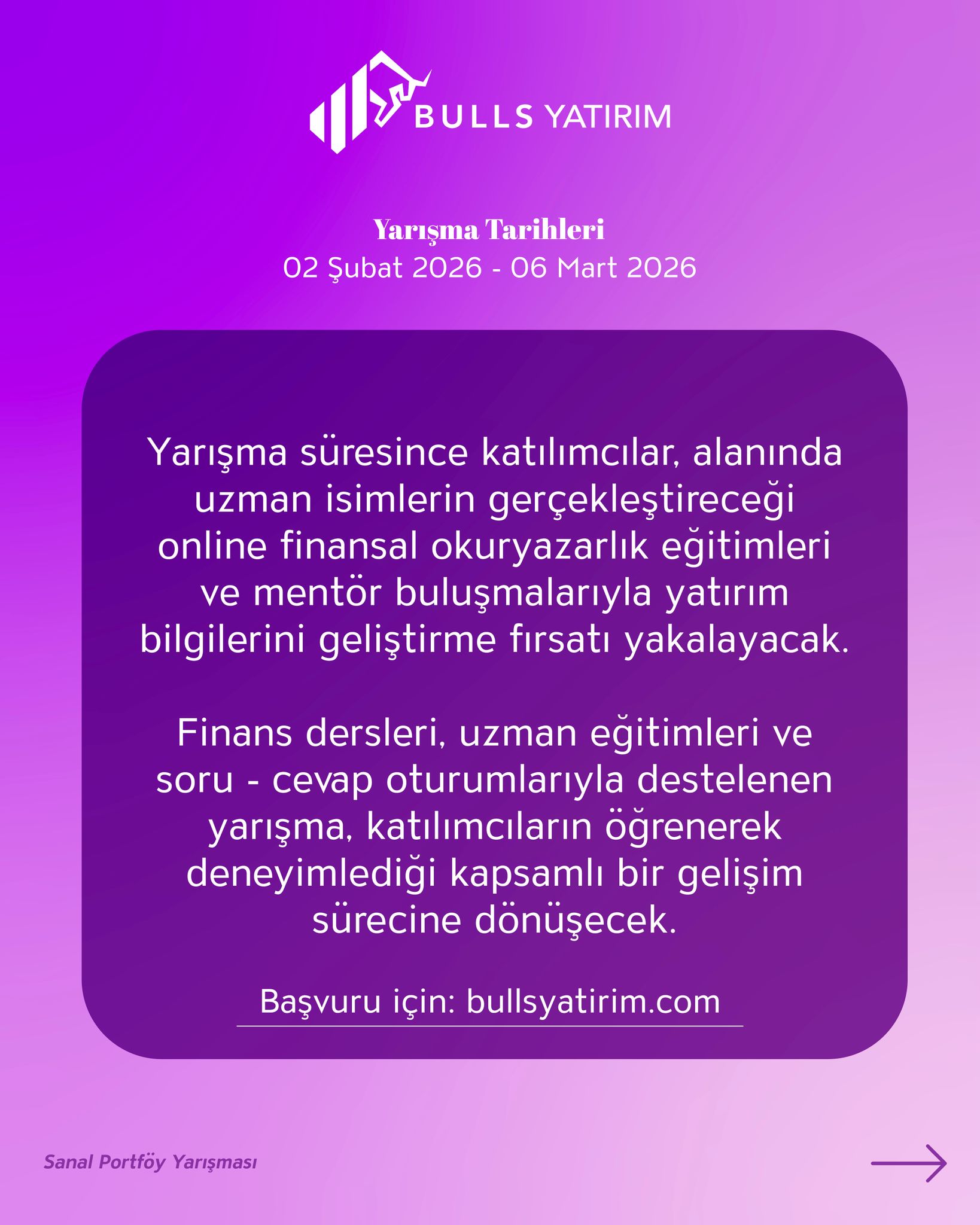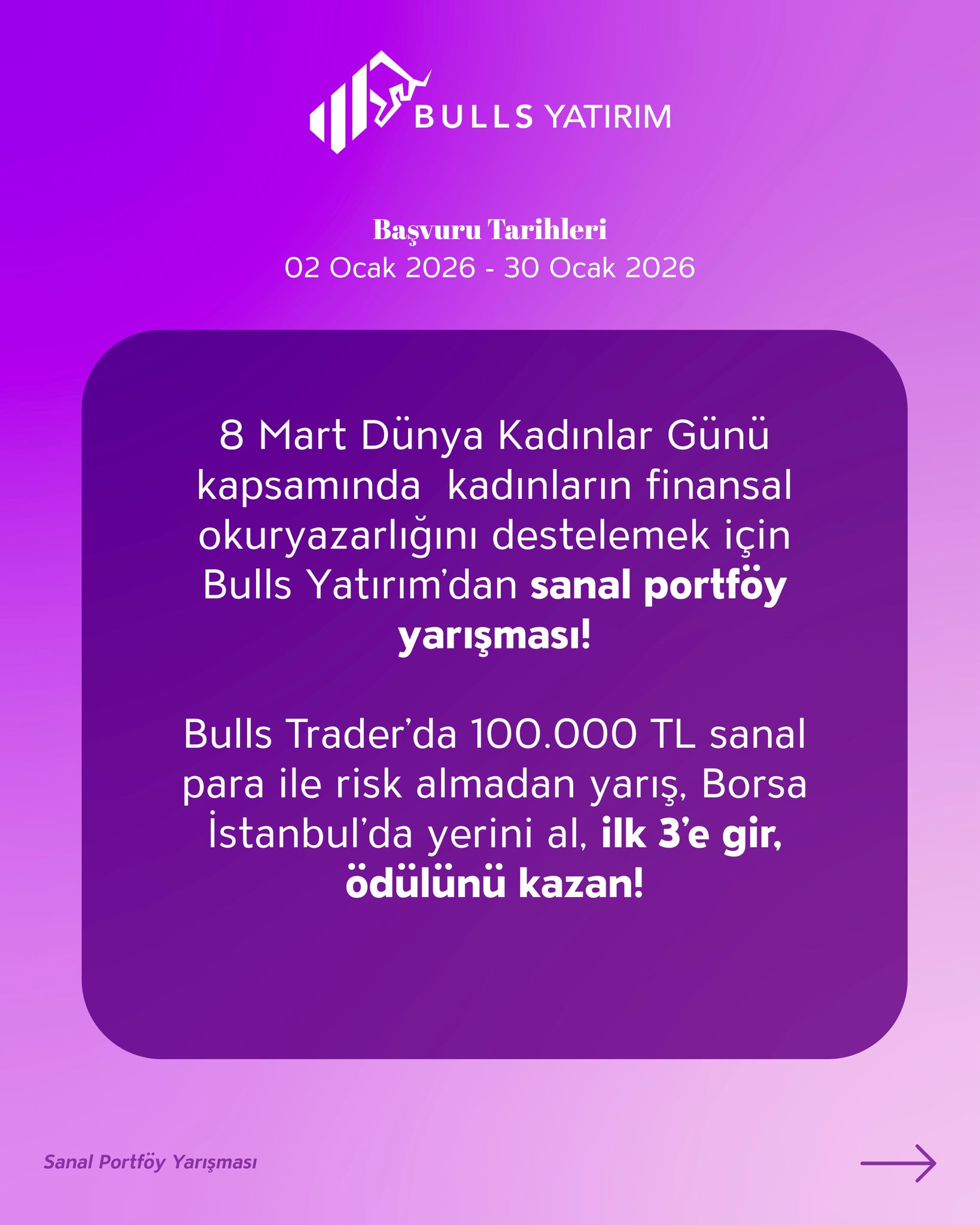 Kadın yatırımcılara özel olarak düzenlenen Bulls Yatırım-Sanal Portföy Yarışması, 02 Ocak 2026 ile 30 Ocak 2026 tarihleri arasında Bulls Yatırım internet sitesi üzerinden gerçekleştirilecek başvurularla başlayacak. Yarışma, 02 Şubat-06 Mart 2026 tarihleri arasında Bulls Trader mobil uygulaması üzerinden, 100.000 TL sanal para ile risk almadan Matriks altyapısı ile yürütülecek.