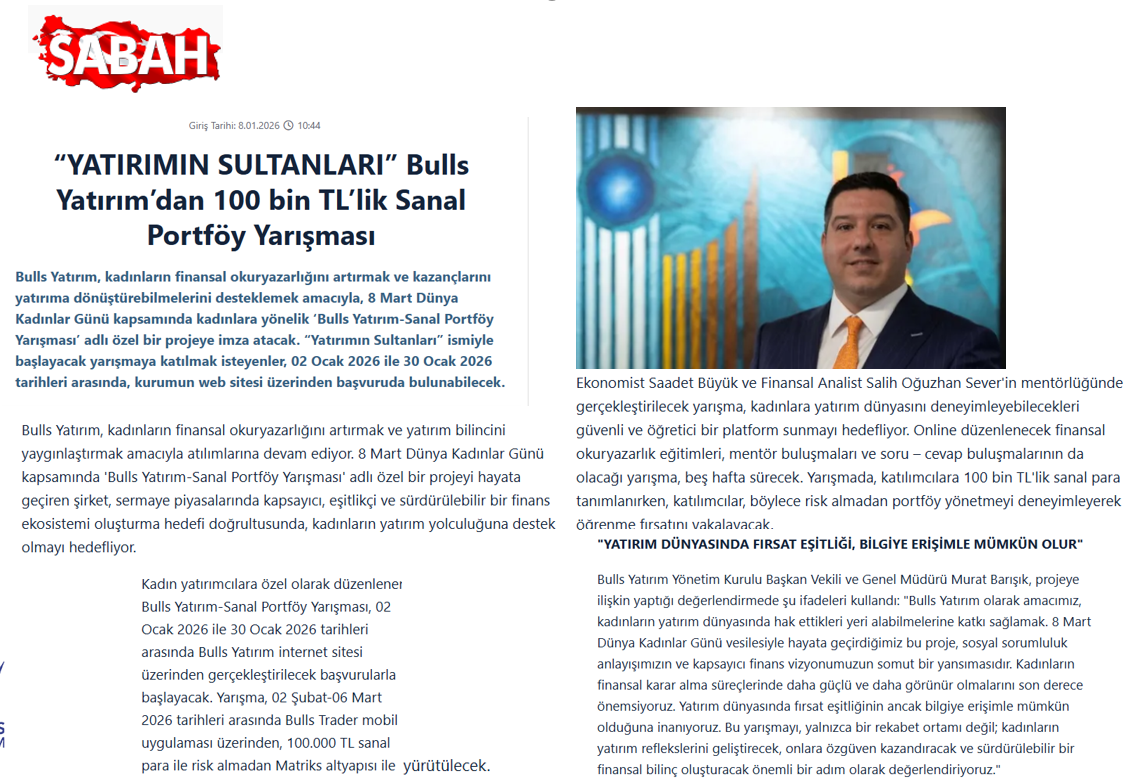 Bulls Yatırım, kadınların finansal okuryazarlığını artırmak ve kazançlarını yatırıma dönüştürebilmelerini desteklemek amacıyla, 8 Mart Dünya Kadınlar Günü kapsamında kadınlara yönelik ‘Bulls Yatırım-Sanal Portföy Yarışması’ adlı özel bir projeye imza atıyor.